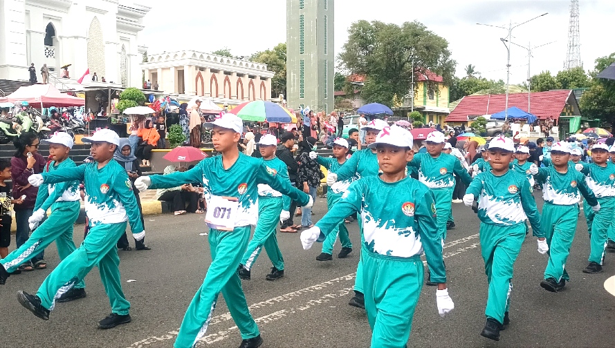 Salah satu tim yang mencuri perhatian adalah SDN 1 Lamappoloware, Kecamatan Lalabata. Dengan kostum hijau cerah dan gerakan yang kompak, para siswa-siswi tak hanya berjalan berirama, tetapi juga menyuguhkan formasi dinamis yang memamerkan kedisiplinan dan kekompakan tim.